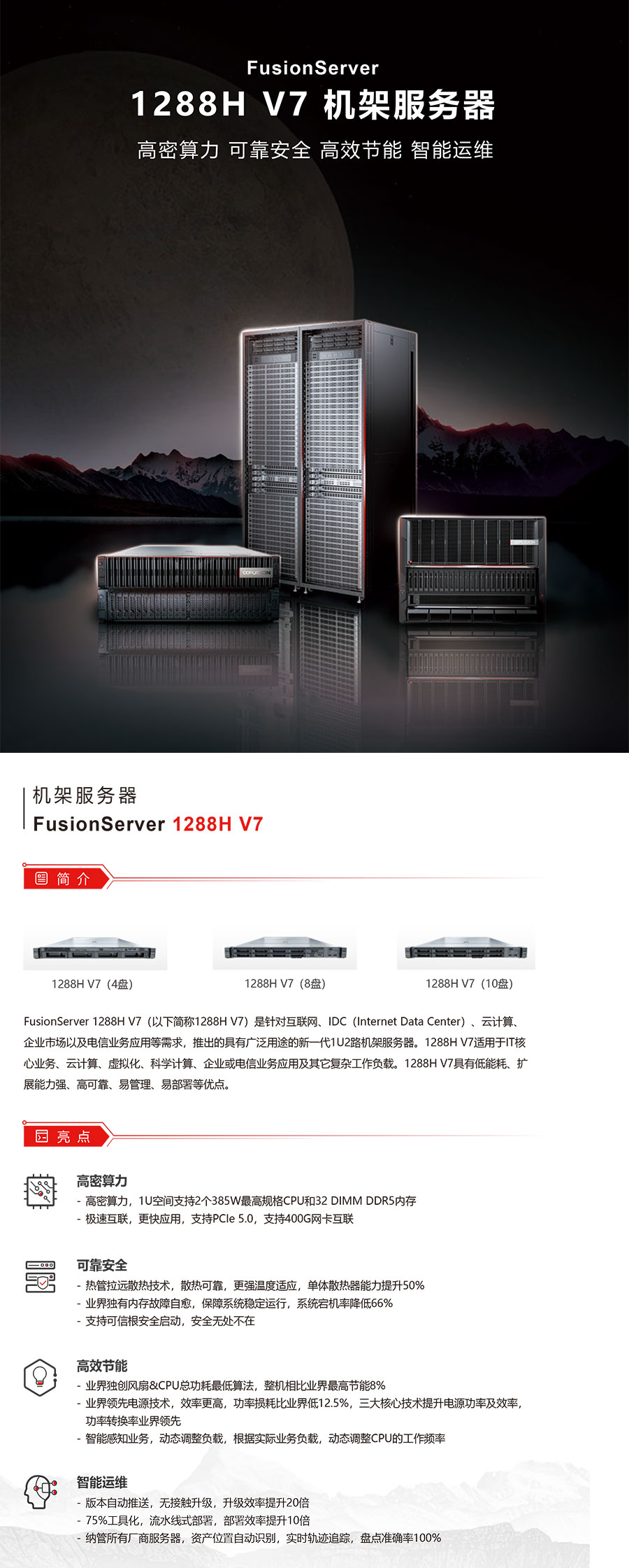 FusionServer 1288H V7是针对互联网、IDC(Internet Data Center)、云计算、企业市场以及电信业务应用等需求,推出的具有广泛用途的新一代1U2路机架服务器。