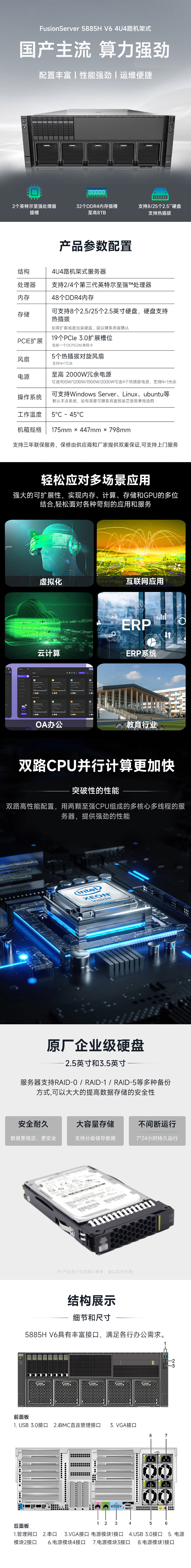 FusionServer 5885H V6是一款4U4路机架服务器,适用于关键业务的高可靠高性能要求,以及虚拟化、高性能计算(HPC)、数据库等计算密集型业务需求。