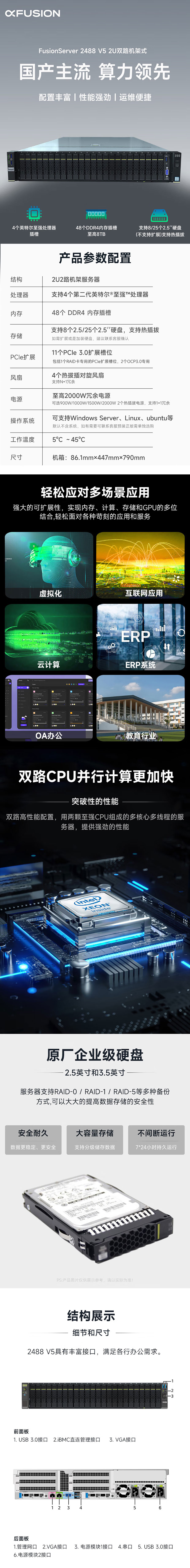 超聚变2488V5 2U机架式服务器主机GPU高性能计算 深度学习 虚拟化(2颗*英特尔至强 金牌5215 2.5GHz 二十核心|64GB内存|3块*1.8TBSAS硬盘|9460-8i阵列卡|双电源|三年保修)