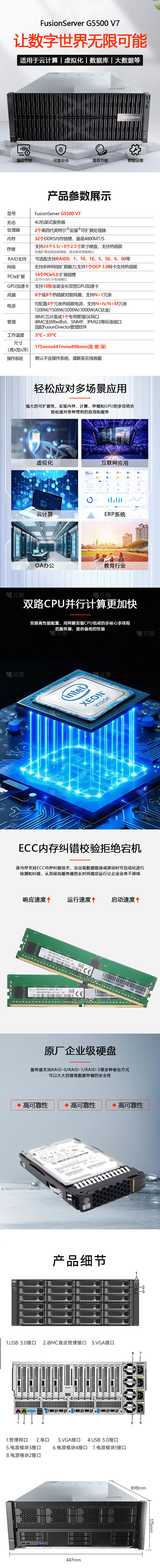 FusionServer G5500 V7(以下简称G5500 V7)是新一代4U2路AI服务器,最多支持10个双宽GPU卡,具备4个PCIe标准卡和3个OCP卡的扩展能力,通过支持24个3.5寸硬盘或12个NVMe SSD盘获得超大容量或超高速存储。